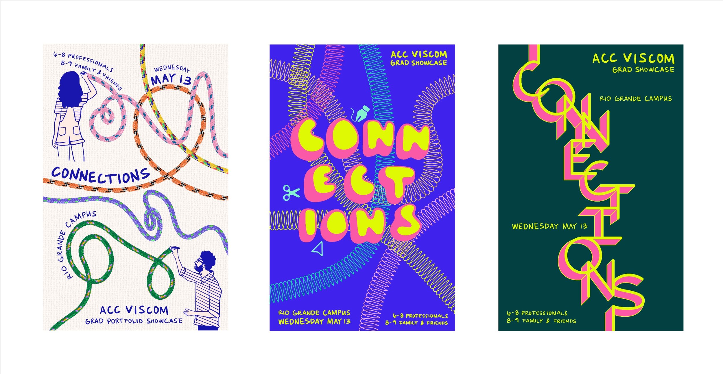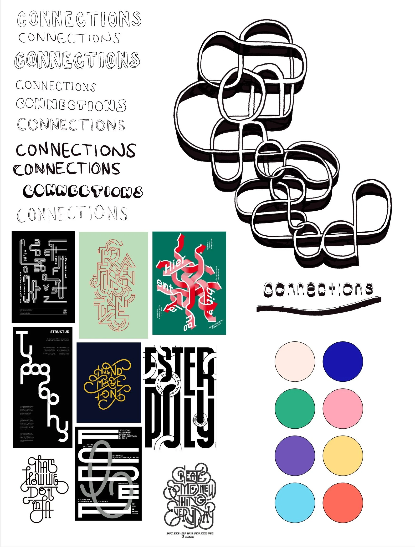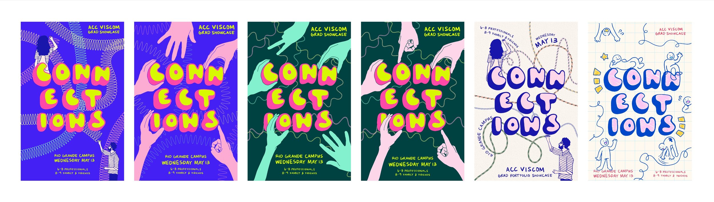 After meeting with faculty, we decided to move forward with the theme of “Connections” as it was the most clear and developed direction. We also received positive feedback on the hand-drawn type and human elements, which led us to further explore typography, develop hand-drawn letterforms, and introduce a vibrant color palette to bring the posters to life.