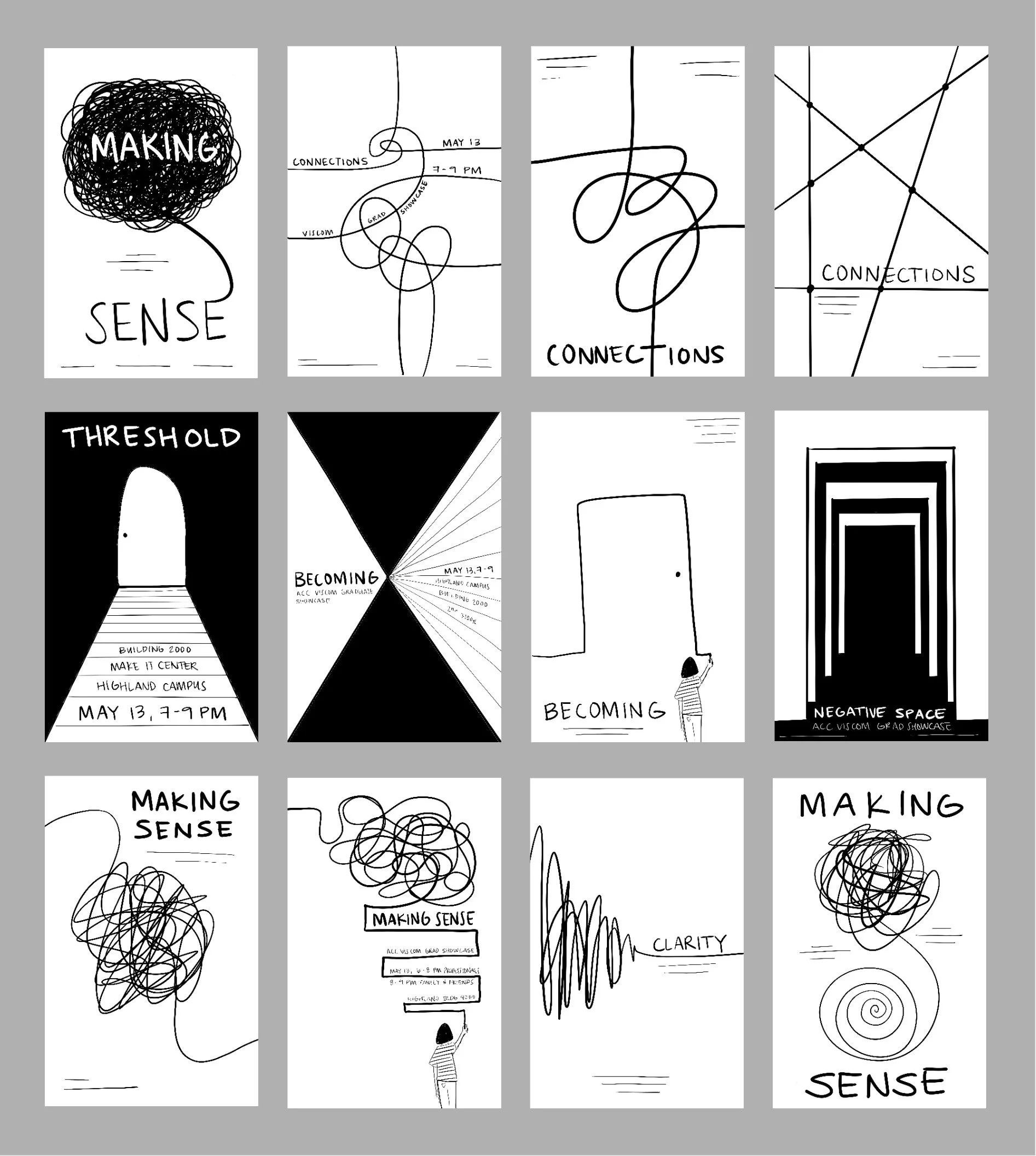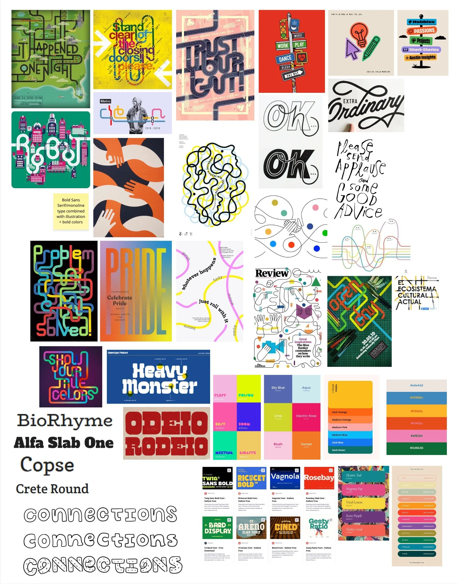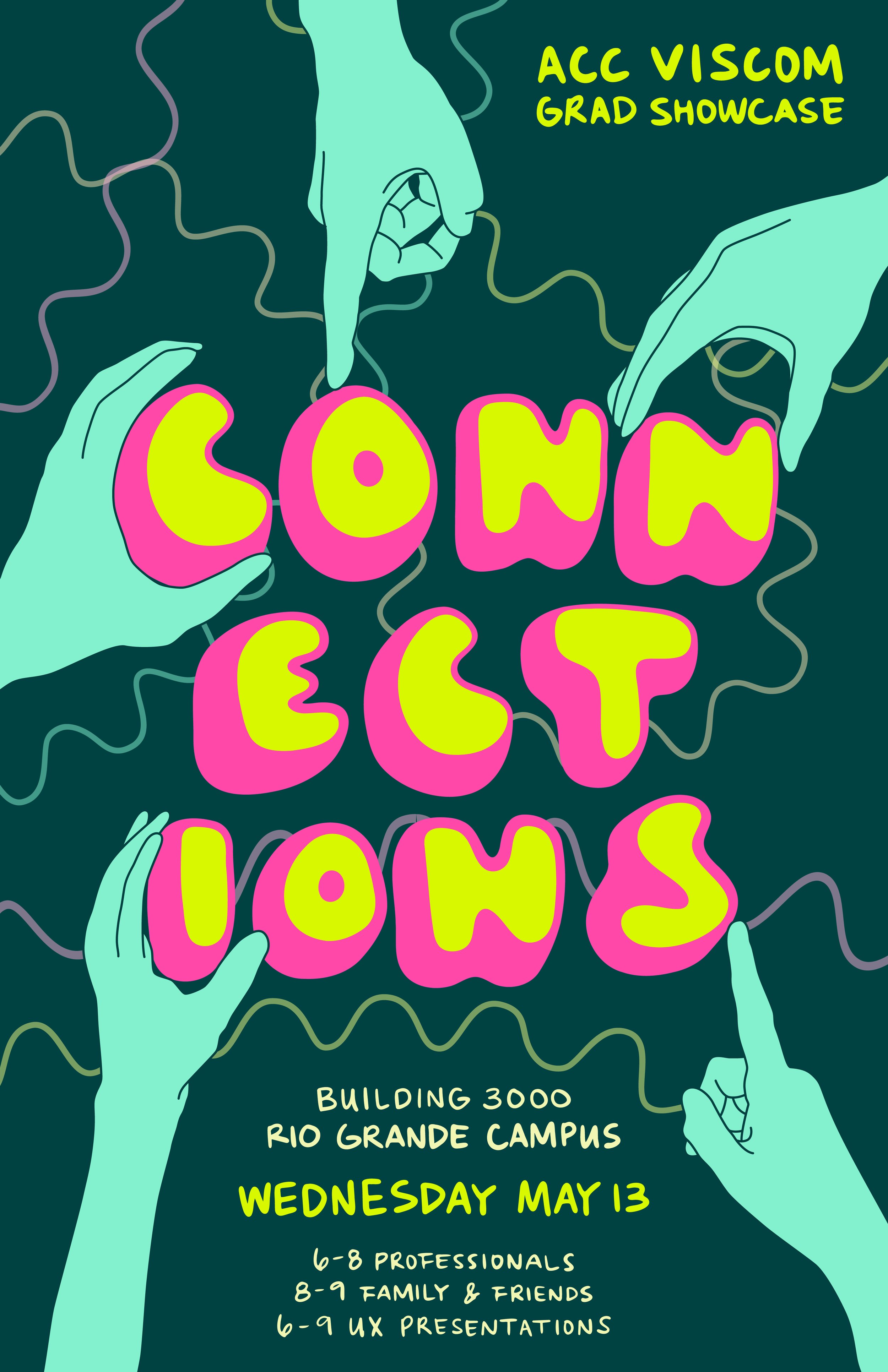 After meeting with faculty, we decided to move forward with the theme of “Connections” as it was the most clear and developed direction. We also received positive feedback on the hand-drawn type and human elements, which led us to further explore typography, develop hand-drawn letterforms, and introduce a vibrant color palette to bring the posters to life.