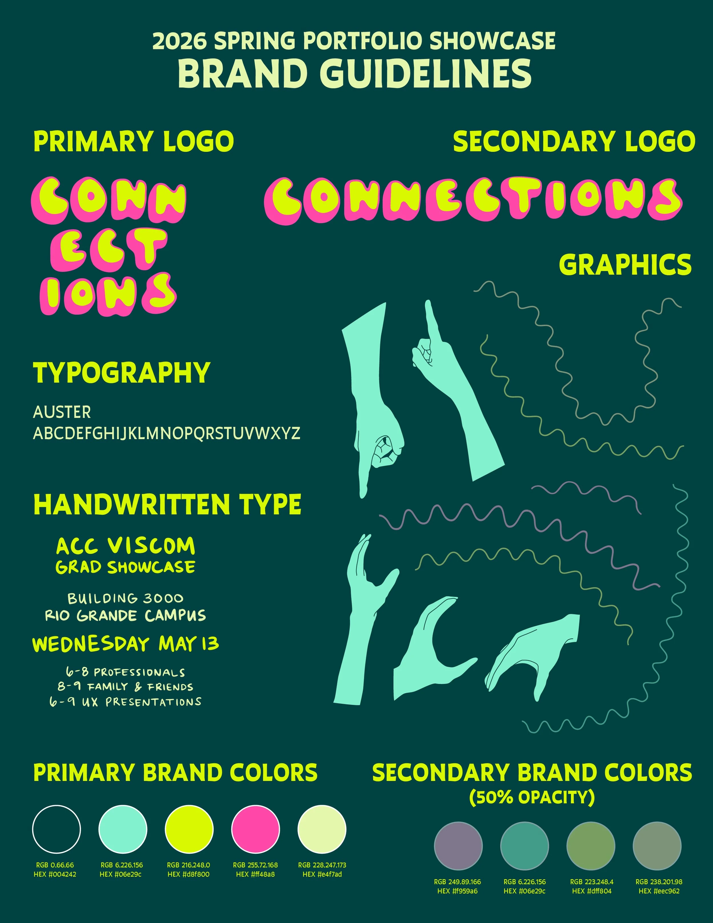 I collaborated with another student, Faith Do, to develop the branding and collateral for the Spring 2026 Visual Communications Grad Portfolio Show at Austin Community College. Working with faculty and program staff, we created a visual direction that would appeal to both local design professionals and current students, while building a cohesive and engaging identity for the event.
