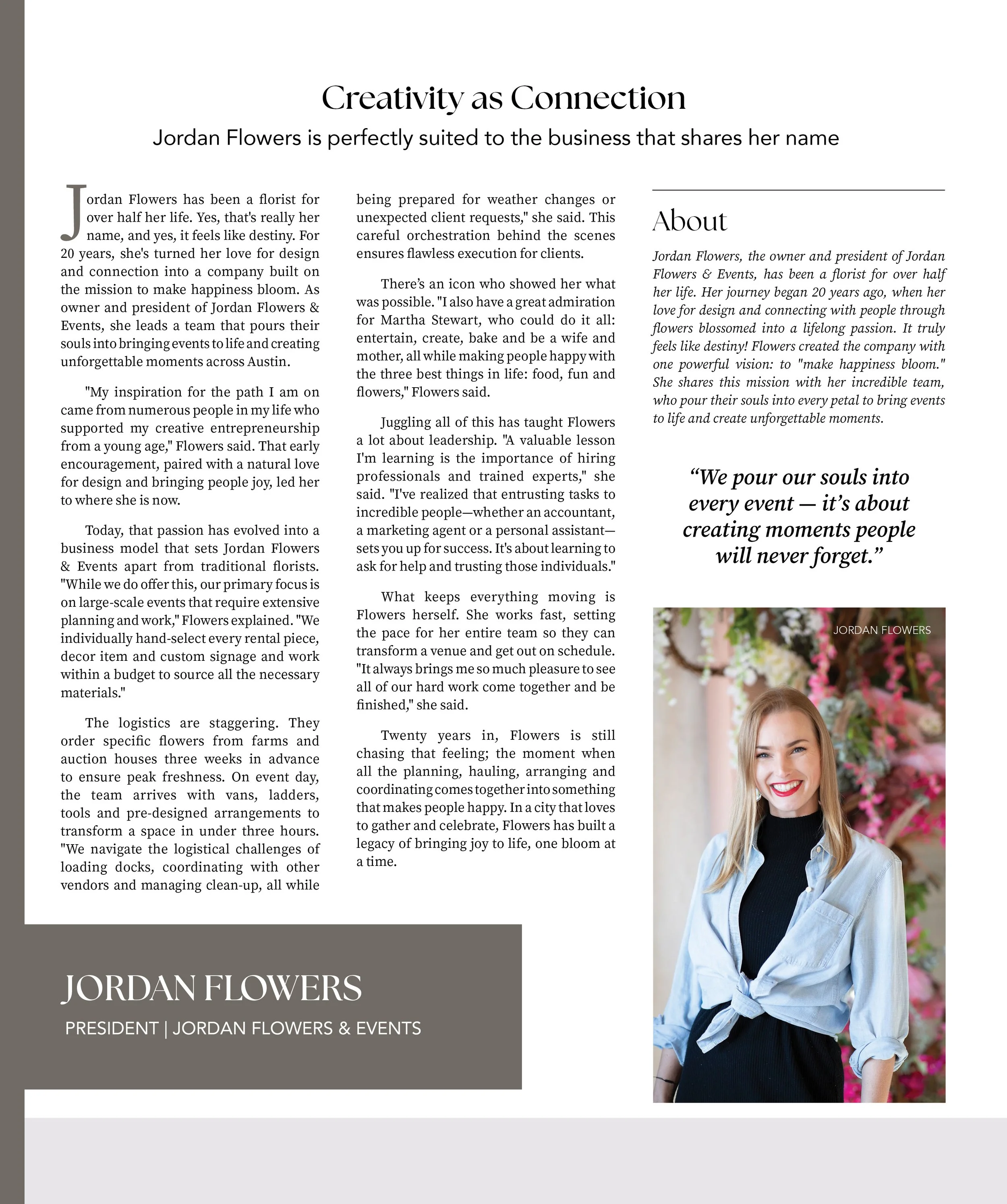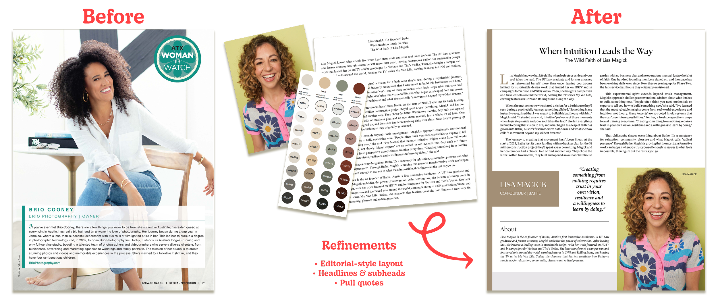 For this freelance project, I designed editorial layouts for both the print and digital editions of Austin Woman Magazine, working within an updated visual direction that included new typefaces and refreshed brand colors.
