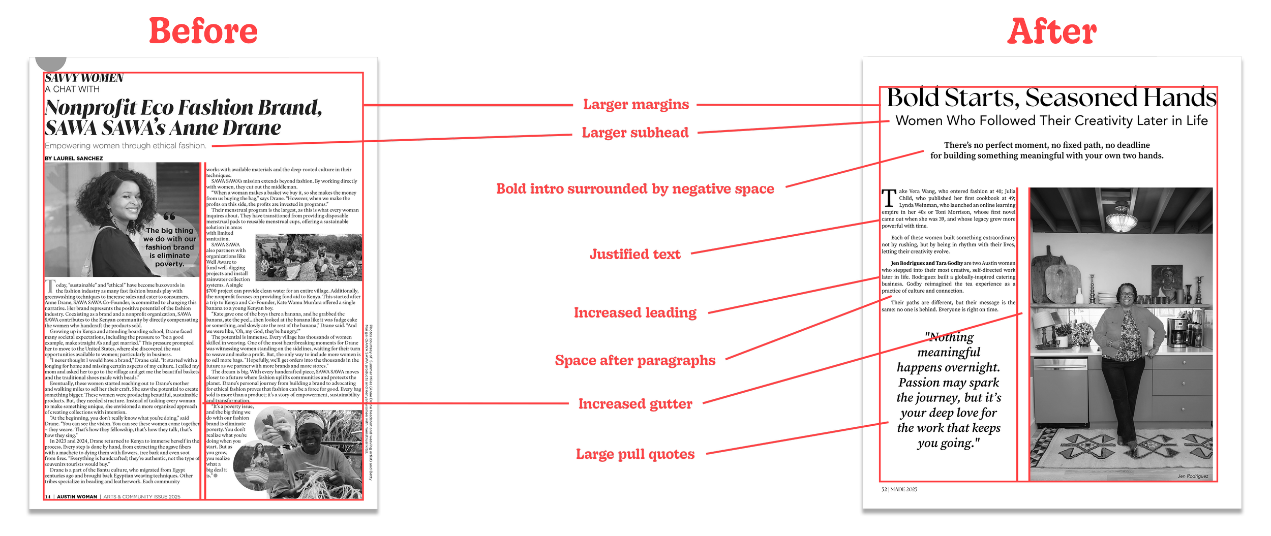 By introducing larger margins, increased leading, and more space between paragraphs, the newer article layouts feel more open and approachable, breaking dense blocks of text into a rhythm that naturally guides the reader down the page. A larger subhead, bold intro, and oversized pull quotes create clear entry points that draw readers in and make the story feel immediately engaging. The added negative space and wider gutter give the layouts a more elevated editorial feel, while justified body copy brings a sense of refinement and structure.