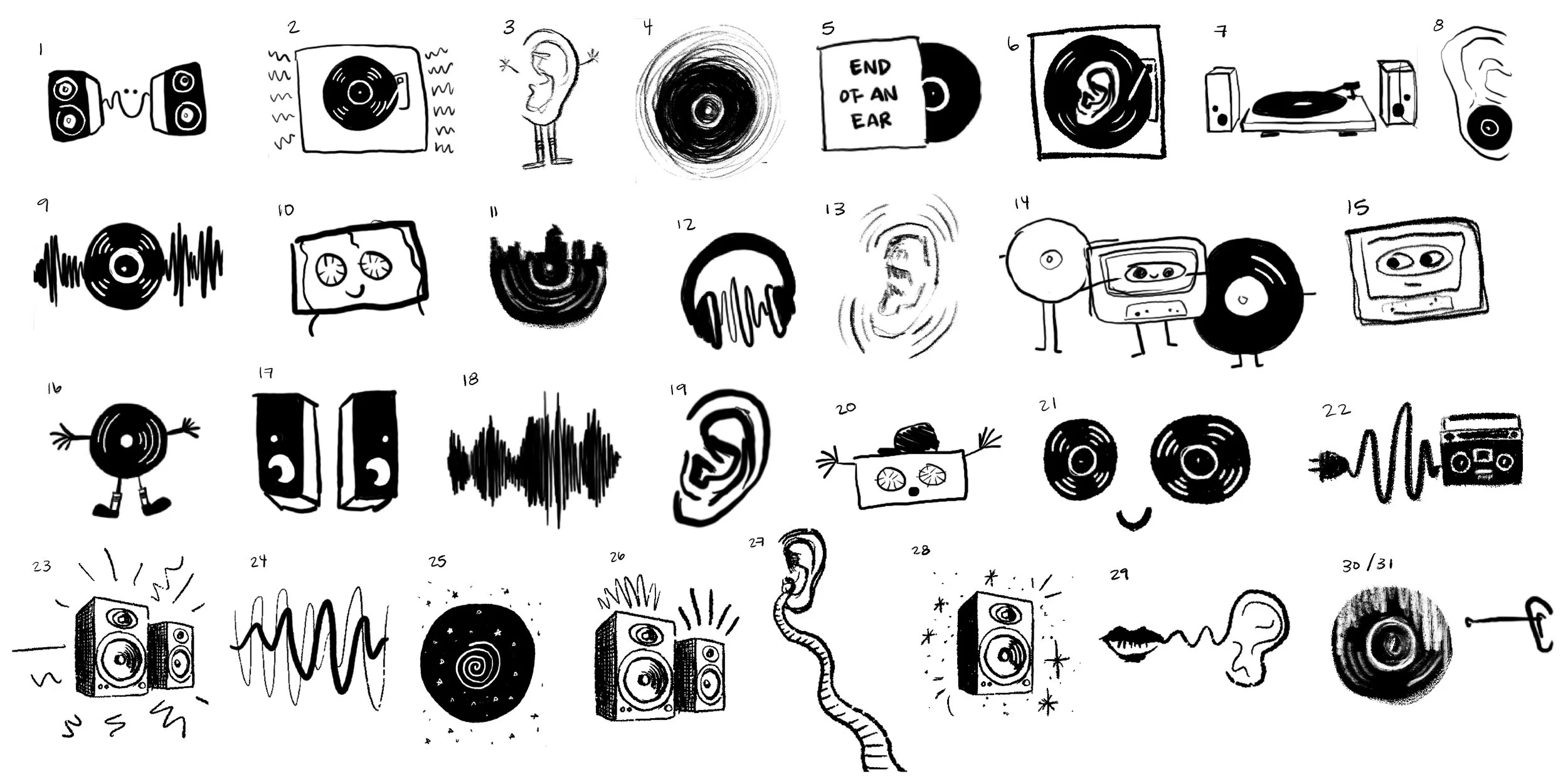 Using a structured ideation process, I created a matrix of keywords to guide early exploration and generate a wide range of visual concepts rooted in ear and music imagery. This approach helped push beyond obvious ideas and led to more unexpected and playful directions.