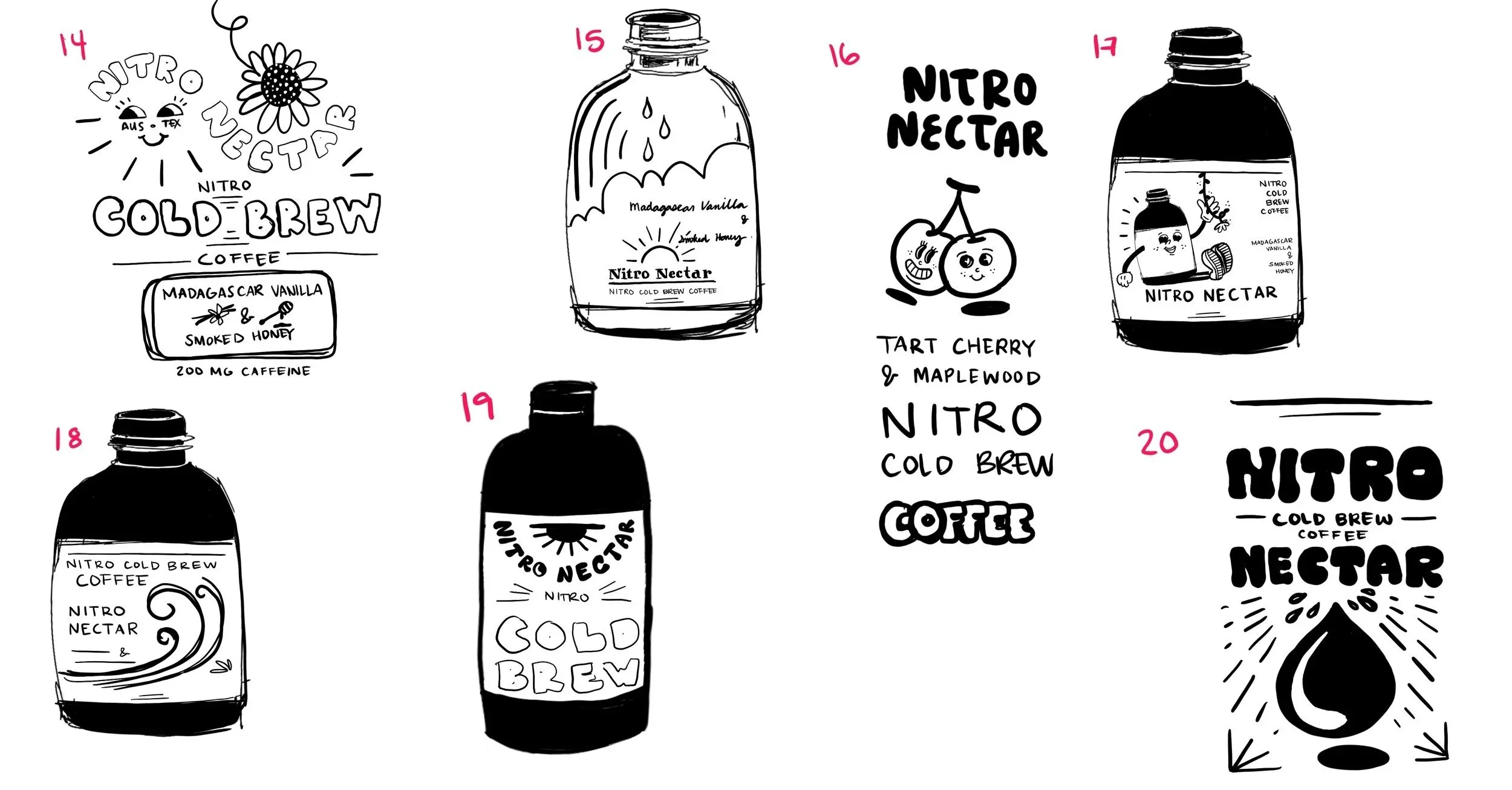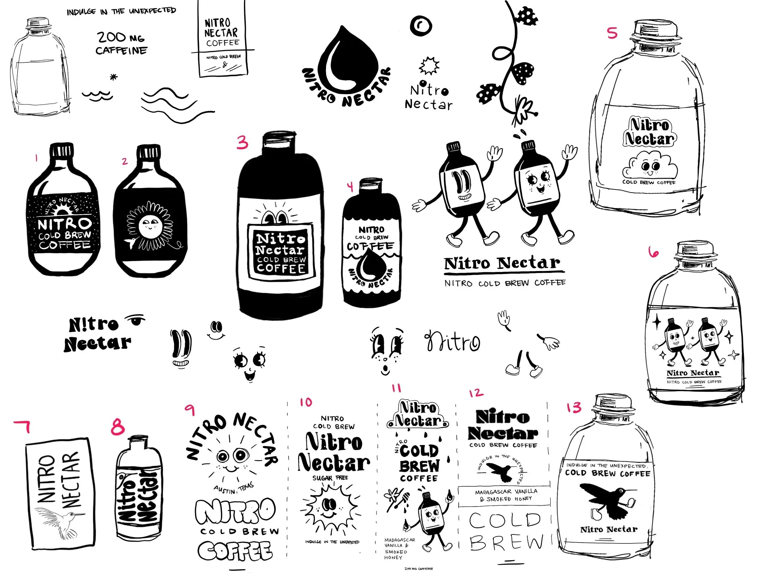 In the sketch phase, I explored themes of natural nectar, morning energy, and dripping, fluid forms that hint at both dripping nectar and the smooth, foamy texture of nitro coffee. This is also where the retro-inspired illustration style began to emerge, adding a sense of whimsy that aligns with the brand’s playful flavor combinations.