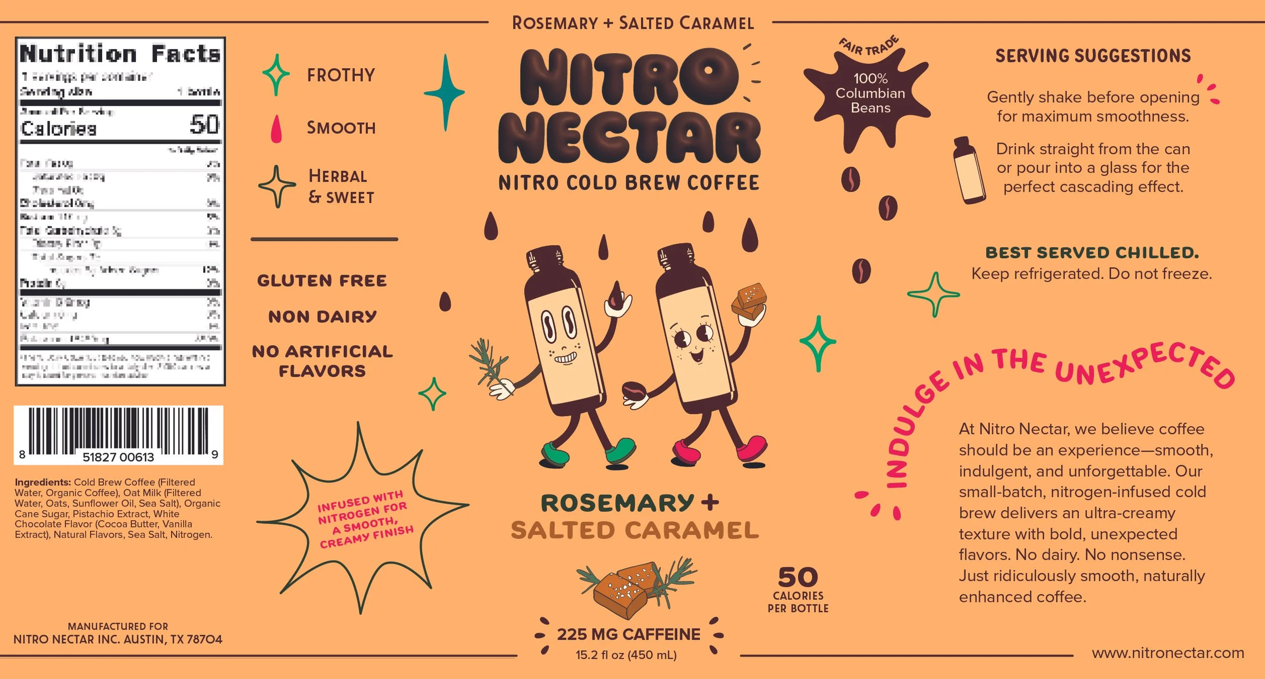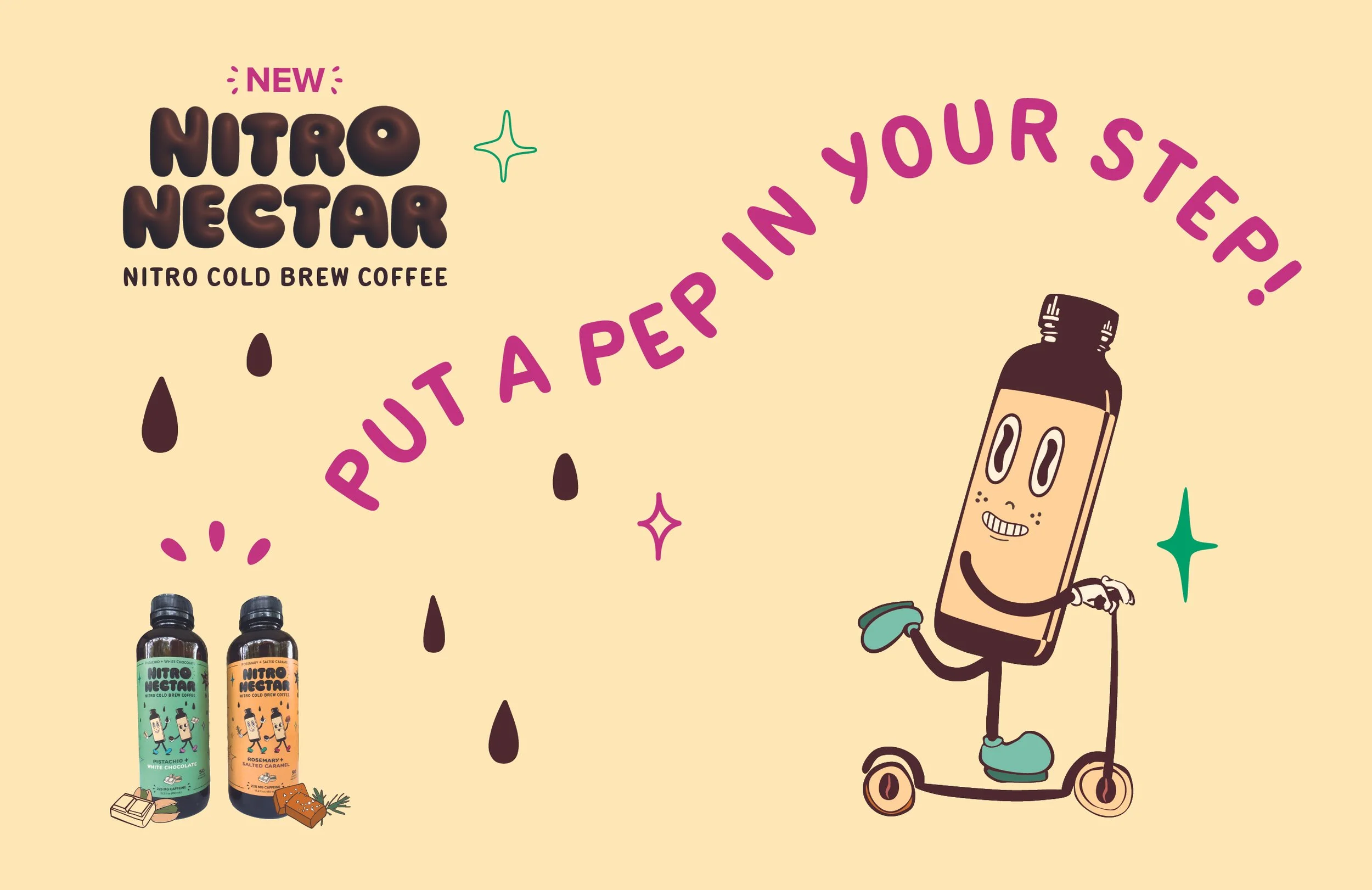Nitro Nectar is a concept nitro cold brew coffee brand featuring unexpected, gourmet-inspired flavors. Designed for those drawn to unique flavors and elevated daily rituals, the project pairs playful packaging with a cohesive ad campaign to make coffee feel more expressive and indulgent.